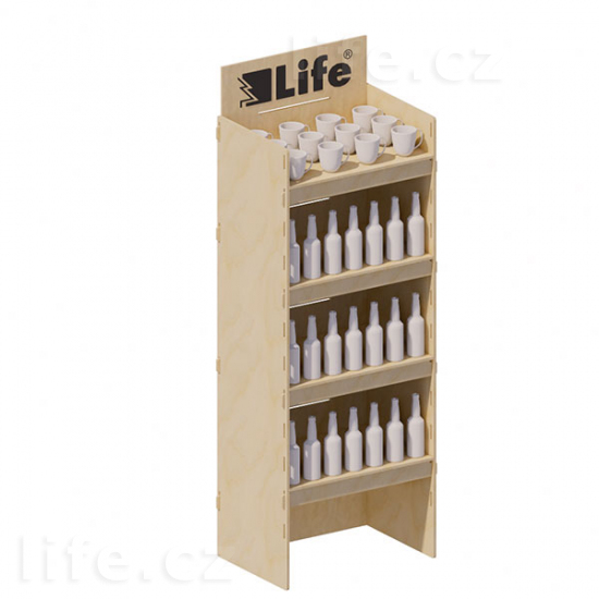 Design stojanu je ve světlé barvě březového dřeva. Díky této barvě regál vhodný na prodej různobarevných předmětů